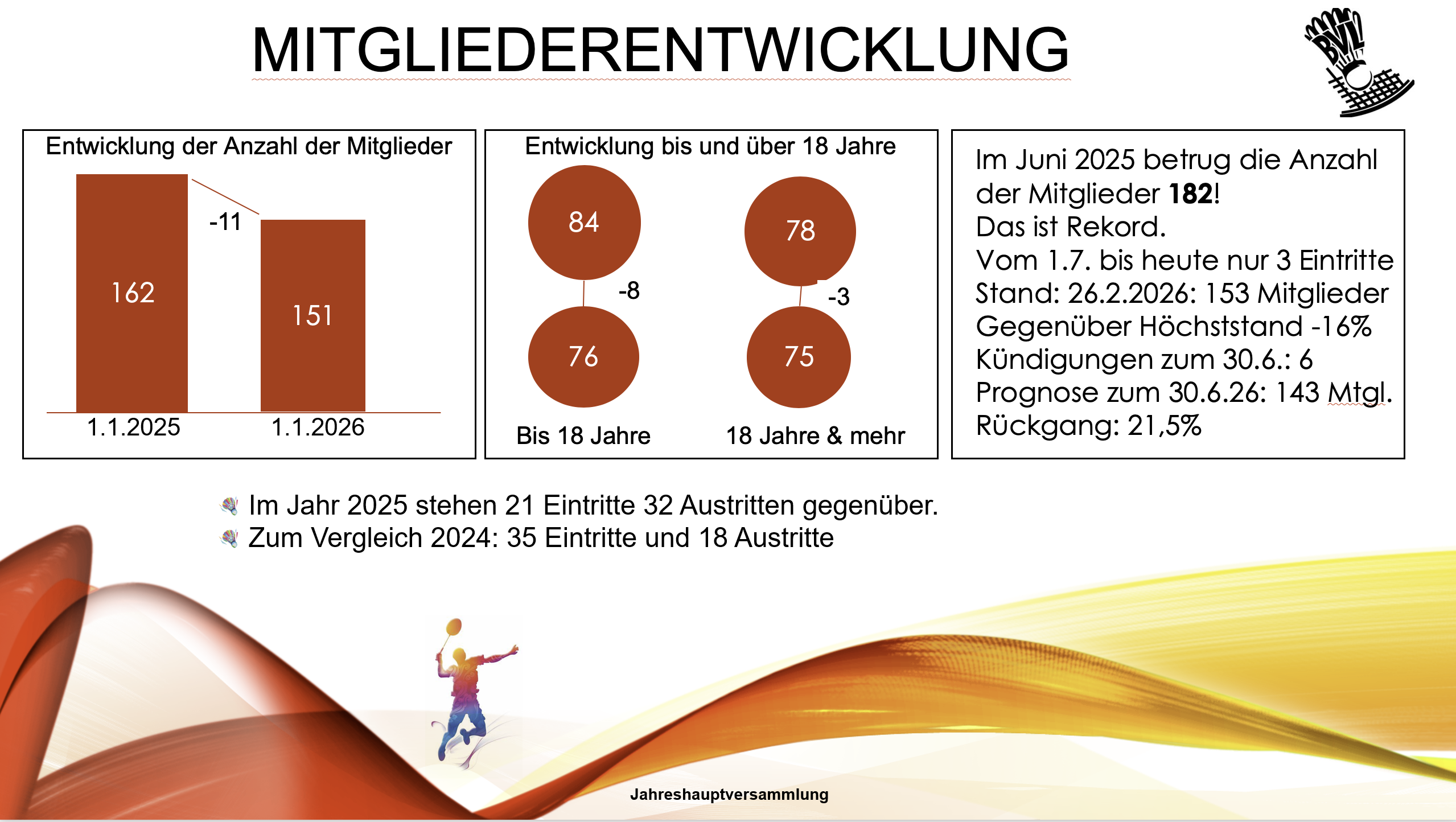 Der Kassenwart Daniel Mahn berichtete, dass das Jahr 2025 besser als erwartet mit einem kleinen Überschuss abgeschlossen wurde. Positiv schlugen der Vereinsförderpreis der Stadt Lampertheim und die Einnahmen aus dem Schleifchenturnier zu Buche. Mitgliedsbeiträge waren die größte Einnahme. Die größten Ausgaben waren Trainerkosten, gefolgt von Trainingsgebühren Smash. Das Smash wurde zum einem großen Teil über eine Sonderumlage für die dort Trainierenden gegenfinanziert. Die Beiträge für Verbände erhöhten sich 2025 deutlich. Die Kosten für Trainingsmaterial, insbesondere Federbälle, waren im letzten Jahr vergleichsweise niedrig, da alle Mannschaftsspiele in der Hinrunde 2025/26 auswärts stattfanden und da die Erwachsenen im Training eigene Bälle verwendeten. In der aktuellen Rückrunde finden hingegen nur Heimspiele statt, weshalb die Kosten für Federbälle steigen und für die Begegnungen der Kinder und Jugend zusätzliche Gebühren im Smash anfallen. Die Anzahl der Mitglieder und die damit verbundenen Mitgliedsbeiträge sind zunächst weiter rückläufig. In der Summe wird deshalb für 2026 ein Verlust erwartet, der aus der Rücklage finanziert werden soll.