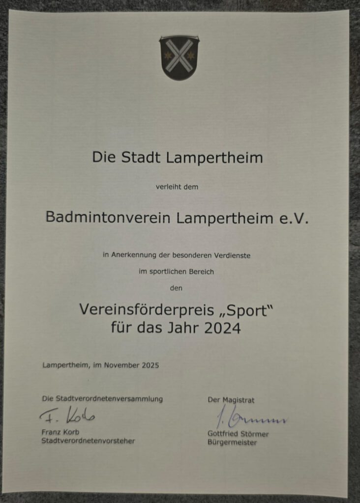 Heute durften wir den Vereinsförderpreis „Sport“ 2024 der Stadt Lampertheim entgegen nehmen. Geehrt wurde jeweils einige Vereine in den Kategorien „Sport“, „Kultur“ und „Jugend“. Dabei konkurrierten wir als der mit Abstand kleinste der geehrten Vereine (162 Mitglieder) mit Vereinen wie dem TV Lampertheim (2000 Mitglieder).